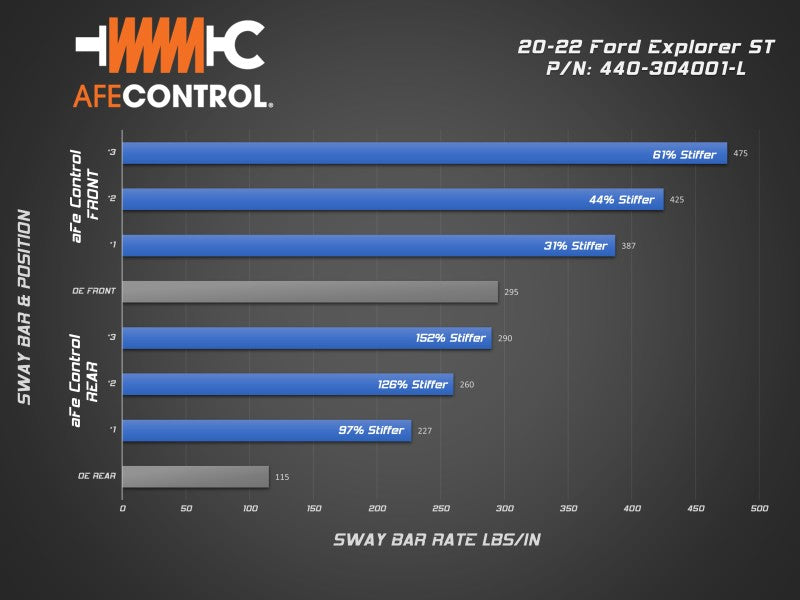 Dramatically reduce body roll without sacrificing ride quality with aFe CONTROL’s Explorer ST sway bars. Our 3-way adjustable rear sway bar will allow you to easily dial in the handling balance of your ST. Sharpened steering response will improve initial turn-in making your Explorer feel lighter and more agile. The added stability and control are also welcome when hauling loads on your roof rack or towing. Whether you’re on a road trip with the family or canyon carving in the mountains, aFe CONTROL will get you there. Every aFe CONTROL sway bar is CAD designed and CNC bent to strict tolerances. This insures precise fit and perfect operation. Our rear sway bar is 3-way adjustable. This allows the driver to dial in the rear roll resistance to achieve the desired handling bias. The rear sway bar utilizes laser cut end plates. These are robotically welded to the bar in a dedicated fixture to insure accurate hole positioning and consistent manufacturing. aFe CONTROL includes low-deflection polyurethane bushings and premium 6061-T6 aluminum black anodized billet brackets which are equipped with grease fittings for easy maintenance.